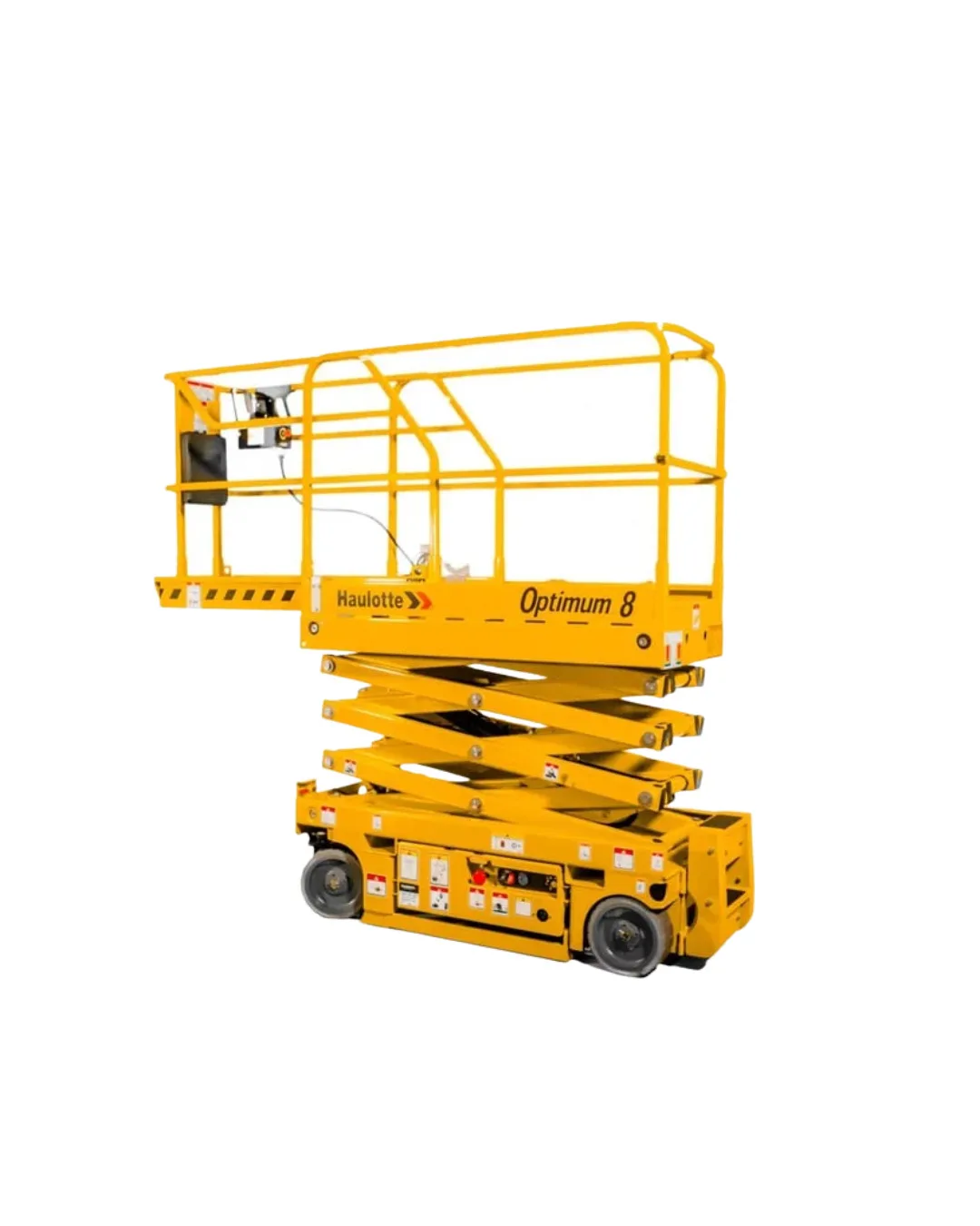 A Plataforma Tesoura Elétrica Haulotte Optimum 8 AE é reconhecida pela agilidade, segurança e operação suave em trabalhos em altura de até 8 metros.